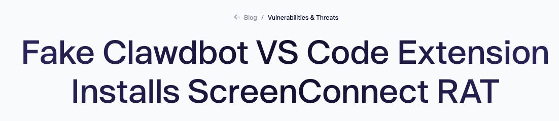 Building on the scheme of exploiting the excitement around Clawdbot, AppSec team Aikido reported they identified a malicious “Clawdbot Agent” that is a functional trojan VS code extension. It’s a working AI coding assistant on the surface but drops malware onto Windows machines when VS code starts, including legitimate ScreenConnect software that’s been weaponized to a relay server.