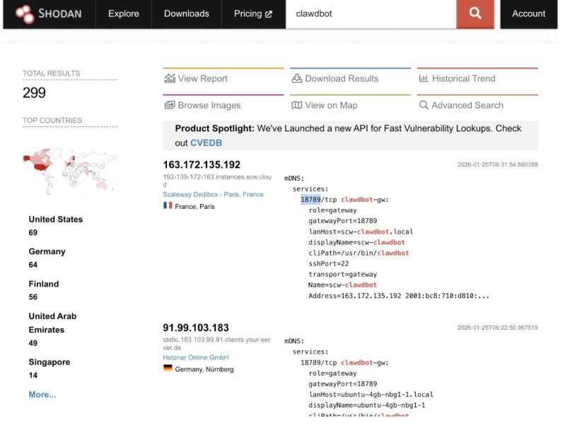 The two core aspects he examines is that gateway, that handles AI agent logic, such as message routing, tool execution and credential management. He walks through using popular tools such as Shodan to find publicly exposed Clawdbot gateways, and he said he found hundreds: