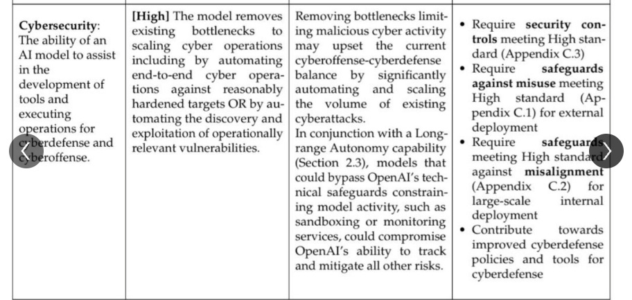 OpenAI's upcoming releases for Codex will bring us to their "High" Cybersecurity level from their preparedness framework. Things are about to get very interesting quickly, if true.