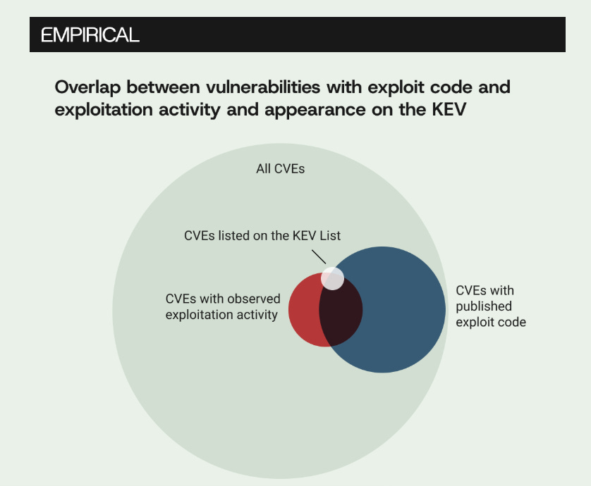 I've been enjoying the recent blogs from Michael Roytman, Ed Bellis and the Empirical Security crew. In this one, they highlight how despite the 2x growth of the Cybersecurity and Infrastructure Security Agency Known Exploited Vulnerability (KEV) catalog since 2022, the actual exploited CVE ecosystem is significant larger, to the tune of tens of thousands of known-exploited CVE's, showing the KEV at best is < 10% of known exploited CVE's.