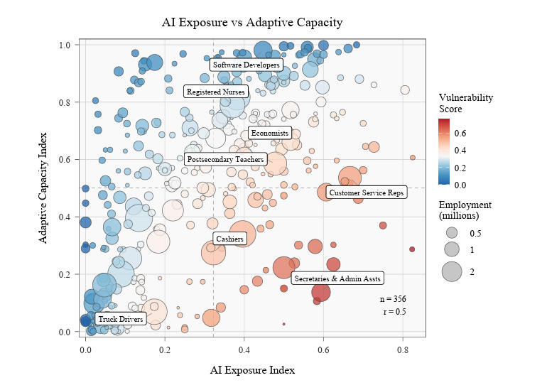 In the paper, they lay out what they define as their “AI Exposure Index” and it includes a chart contrasting the Adaptive Capacity vs. AI Exposure across various jobs. Some jobs are less exposed to AI, while some among the workforce are deemed more adaptable. Software Developers for example are ranked strongly in terms of AI exposure, but also in terms of being highly adaptive.