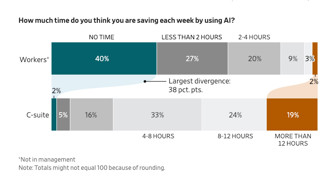 This caught my attention because it speaks to a disconnect I’ve observed in security organizations too. According to the WSJ, 19% of CEOs say AI saves them 12+ hours per week, but 40% of workers say it saves them no time at all.