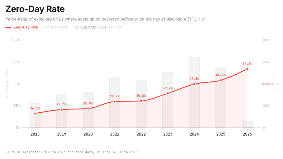 → 2026: 67.2% of exploited CVEs are zero-days, up from 16.1% in 2018