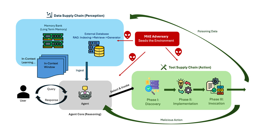 This paper introduces a “Man-in-the-Environment” (MitE) adversary model that systematizes how attackers can exploit the runtime dependencies of agentic systems. The key insight: the attack surface has shifted from build-time artifacts to inference-time dependencies. Poisoned perception triggers unauthorized tool actions, while tool outputs re-enter the environment as tainted context, enabling persistent compromise and viral-style propagation.