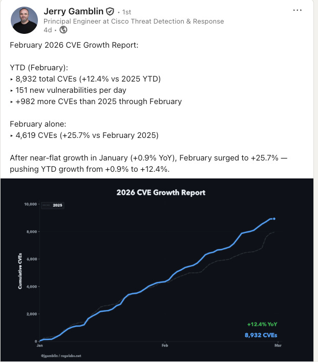 Jerry Gamblin continues his invaluable CVE tracking work. After 2025 set a new record with 48,185 published CVEs (a 20.6% year-over-year increase), the 2026 trajectory suggests we could hit roughly 55,000 disclosures this year. These numbers reinforce what I’ve been saying since “Effective Vulnerability Management”: organizations cannot treat every CVE as a fire drill. Risk-based prioritization informed by exploitability data, asset criticality, and business context is not a nice-to-have. It is the only viable approach at this volume.