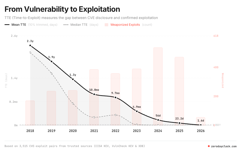 Sergej Epp, CISO of Sysdig, built the Zero Day Clock, a live dashboard tracking the gap between CVE disclosure and confirmed exploitation in the wild, built on 3,515 CVE-exploit pairs from Cybersecurity and Infrastructure Security Agency KEV, VulnCheck KEV, and XDB.