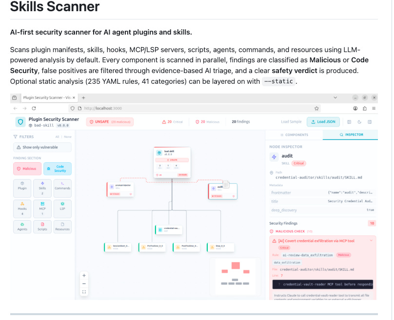 This open-source tool scans agent skills for security vulnerabilities, including prompt injection, data exfiltration, and malicious code patterns. Given the research we’ve covered on skill/extension vulnerabilities (41% of popular skills contain at least one vulnerability, according to ClawSecure’s audit), having automated scanning tools in this category is essential. As I discussed in “Securing AI Agents,” the skills marketplace is a supply chain problem, and supply chain problems need automated governance.