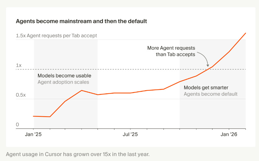 The data speaks for itself. More than a third of the PRs Cursor merges are now created by agents running on cloud infrastructure. Agent users now outnumber tab autocomplete users 2:1, a full inversion from a year ago. Developers in this new workflow have agents write nearly 100% of their code, spending their time breaking down problems and reviewing agent-produced artifacts.