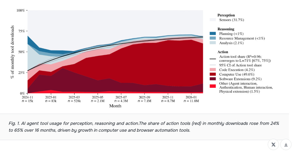 The UK AI Safety Institute, working with the Bank of England, published remarkable data on AI agent tool adoption. MCP tools grew from roughly 5,000 to 177,436 over 16 months, with downloads surging from 80,000 to 14 million. The most striking shift is that action tools grew from 24% to 65% of monthly downloads, confirming the fundamental transition from analysis to action that defines the agentic era.