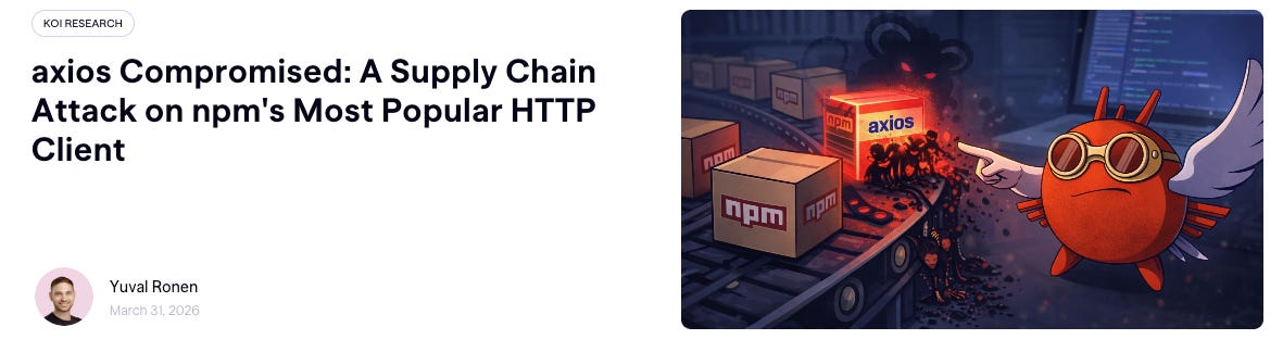 This is the supply chain story of the week, and given what we covered with TeamPCP/LiteLLM in issue #90, the timing could not be worse. Axios, the npm package that handles HTTP requests for roughly 80% of cloud and code environments with approximately 100 million weekly downloads, was compromised after attackers hijacked the npm account of jasonsaayman, the lead maintainer. Within a 39-minute window, two malicious versions were published: 1.14.1 and 0.30.4.