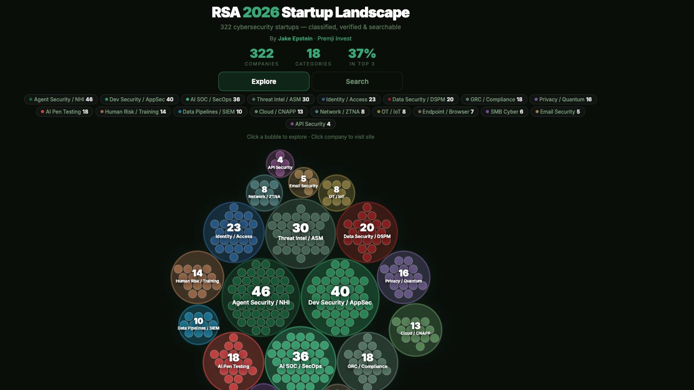 Jake Epstein at Premji Invest published an interactive visualization mapping 320 cybersecurity startups across 18 categories from the RSA 2026 exhibitor catalog. This is a useful tool for anyone trying to understand the competitive landscape, identify white space, or just get a sense of where investment dollars are flowing. Worth bookmarking as a reference.