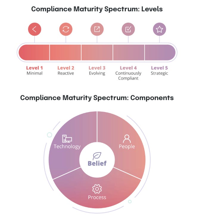 Hyperproof’s Compliance Maturity Spectrum, which allows organizations to self-assess where they are on their compliance journey, from minimal through strategic, and what that looks like from a people, process, and technology perspective