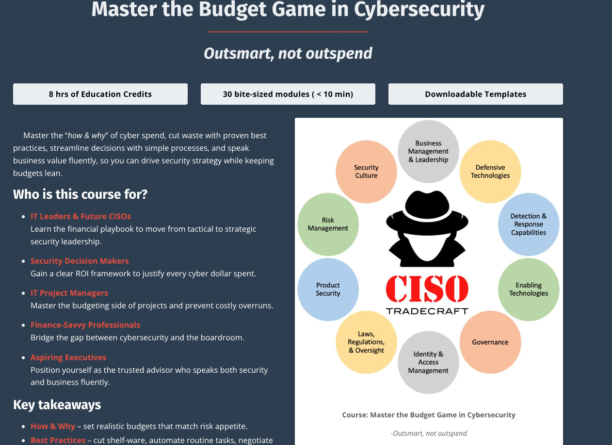 Ross also recently launched a virtual course titled “Master the Budget Game in Cybersecurity”. It includes 8 hours of CPE’s, 30 bite-sized modules, and downloadable templates. The course is currently 50% OFF, so I recommend checking it out now!