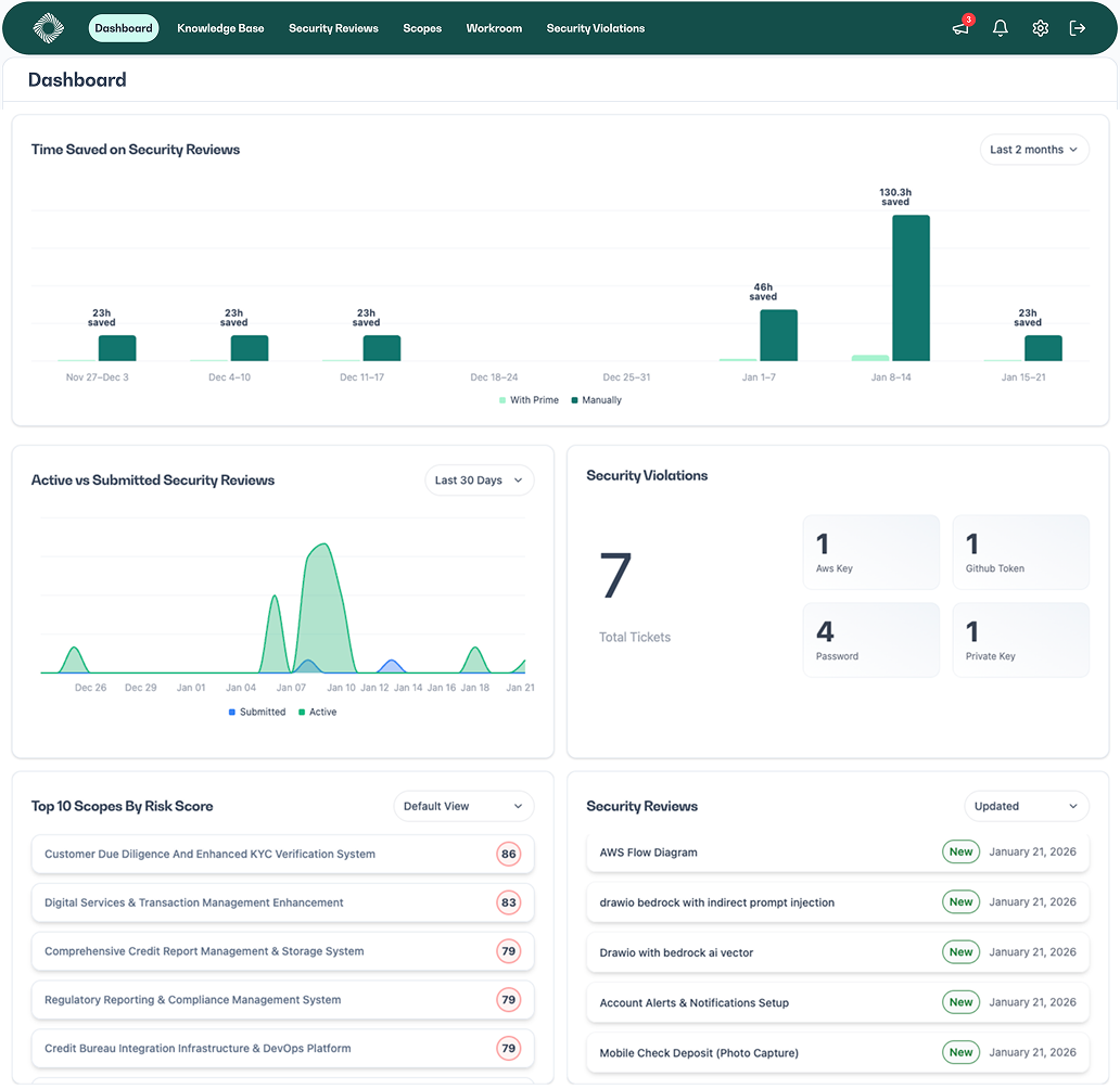 All of this can be presented to security teams and leaders in a comprehensive view to see the time they have saved on traditional time intensive security reviews, how many security violations exist, what the top identified risks are and what security reviews are active, as seen below.