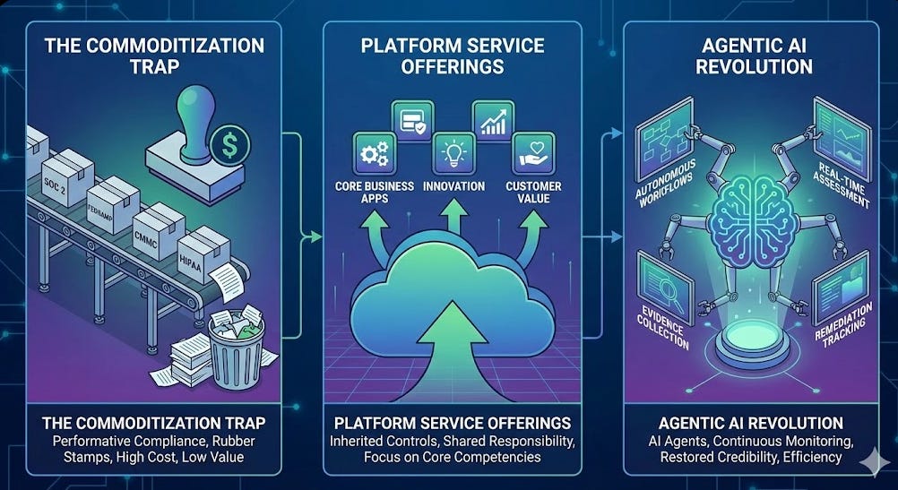 We’re watching three simultaneous forces converge that I believe will fundamentally reshape GRC: the commoditization of compliance creating a credibility crisis, the rise of platform service offerings absorbing undifferentiated heavy lifting, and the emergence of agentic AI that promises to restore both efficiency and integrity to a field in desperate need of both.