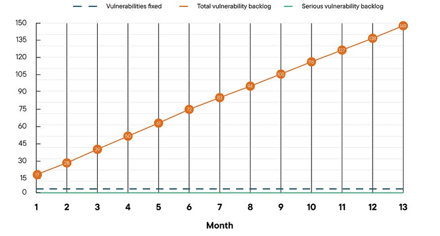 This runaway vulnerability backlog is alarmingly demonstrated in Contrast’s diagram below, showing how the issue grows linearly month after month, with organizations having little to no hope of catching up.