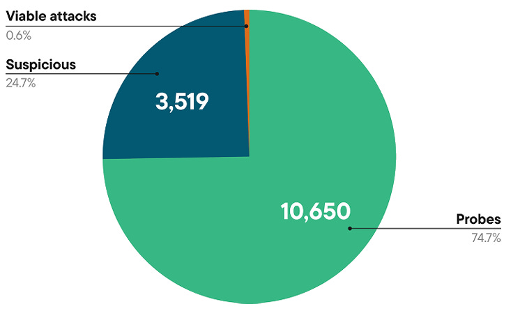 These include various categories such as Probes, Suspicious Attacks, and Viable Attacks. The initial category of course involves automated attempts to discover vulnerabilities and what can be compromised. Suspicious attacks include attempts at exploitation and evasion that aren’t confirmed as successful. The final category consists of confirmed attacks against reachable and exploitable vulnerabilities, which is what organizations should be most concerned with.