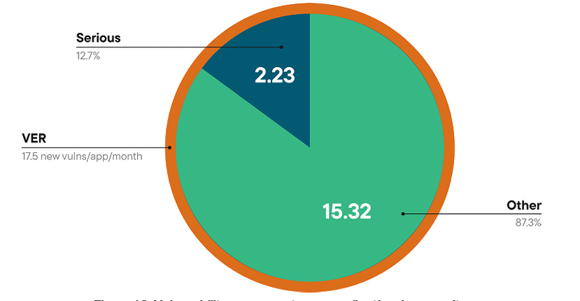 These attempts wouldn’t be so problematic if it weren’t for the fact that applications are increasingly vulnerable, with an average of 30 serious and exploitable vulnerabilities per application, which outpaces their remediation capacity. In comparison, they gain an average of 17 new vulnerabilities per month, resulting in exponential growth of security technical debt and a ripe playing field for malicious actors.