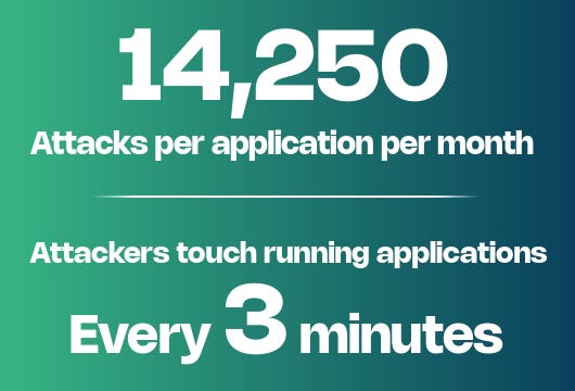 Contrast’s report goes on to highlight key insights that I wanted to unpack here as well. This includes attack volume, with the average application facing 14,250 attacks per month, which equates to attackers interacting with production applications every 3 minutes.