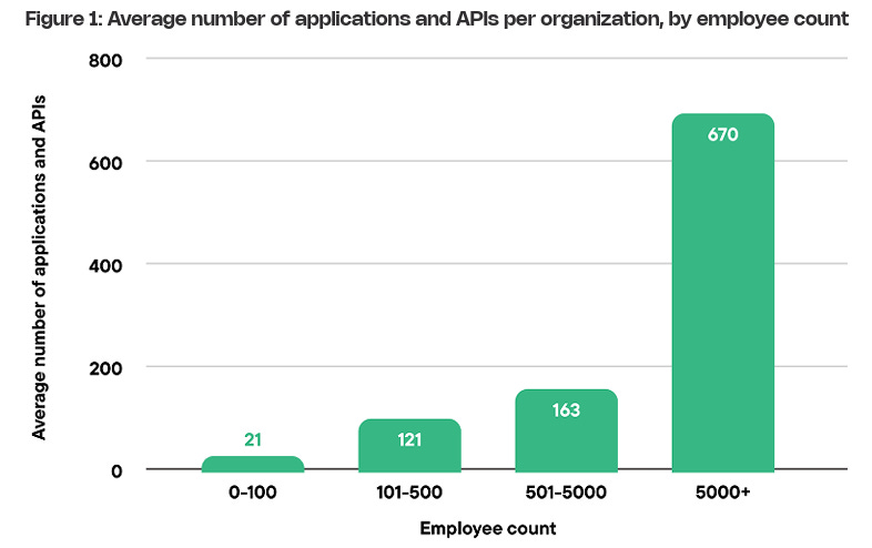 It makes sense that application exploits are one of the dominant attack vectors, too, given that the Contrast report highlights that the average number of applications and APIs per organization, by employee count, is into the hundreds for most, but the smallest enterprises.