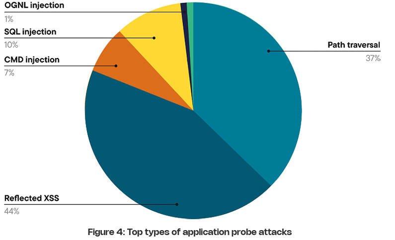 Much like broader industry-wide high-level reports such as Verizon’s DBIR or Mandiant’s M-Trends, it is helpful to understand the type of attacks that are occurring. This informs us of the focus areas and activities of malicious actors, as well as leads to a threat-informed defensive approach, where organizations can prioritize fixing highly targeted vulnerability types. Contrast provides that insight as well, starting with probe types, see below: