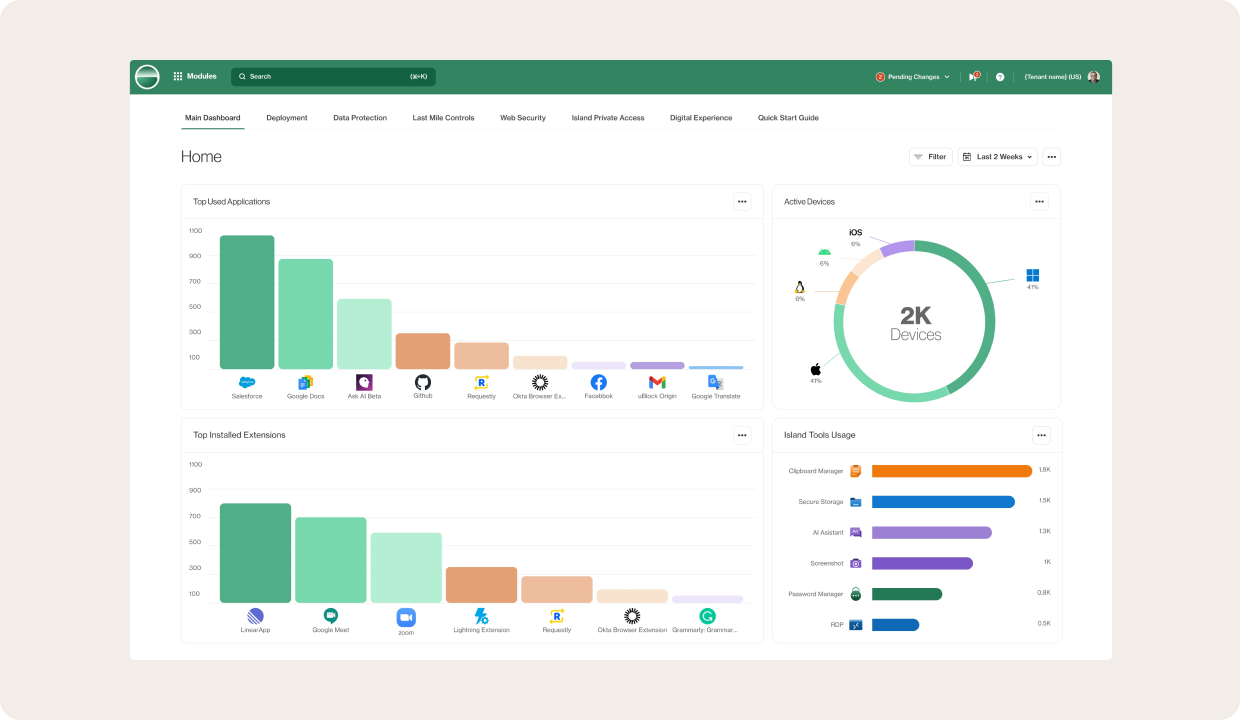 This is taken even further with the ability to control file downloads and usage based not only on group memberships or permissions, but also on context-based access control, such as geolocation, device posture, network, and more. You can also monitor top-used applications, installed extensions, active devices, and even tool usage.