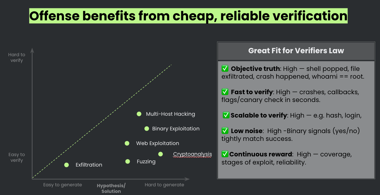 Epp introduces a concept he calls “Verifier’s Law” to explain why AI inherently accelerates offense faster than defense. The answer is verification asymmetry. In offense, feedback is binary and instant: did the exploit succeed? The AI learns at machine speed. In defense, feedback is ambiguous, slow, and expensive. Is this alert real? Is this system secure? The signal is noisy. The learning loop is broken. AI capability scales with the cheapness of verification, and offense has the cheapest verifier in cybersecurity. Sergej discussed this in his article “Winning the AI Cyber Race: Verifiability is All You Need”.