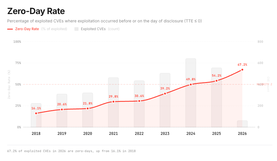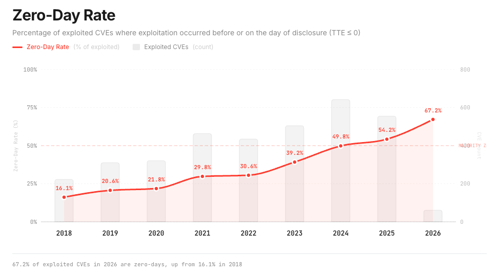 The Zero Day Clock’s most sobering data point may be the zero-day rate itself, 67.2% of exploited CVEs in 2026 are zero-days, up from 16.1% in 2018.