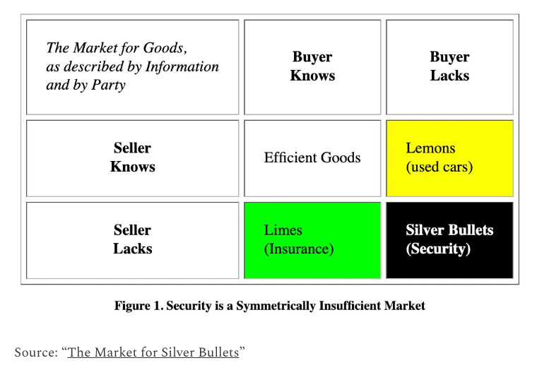From there, the timeline accelerates. Halvar Flake’s BinDiff in 2004 demonstrated that every security patch was simultaneously an exploit blueprint, the fix itself told attackers exactly where to look. Bruce Schneier connected cybersecurity to Nobel Prize-winning economics in 2007, arguing that when buyers can’t judge quality, bad products drive good ones out. The less-secure product is always cheaper, ships faster, and has more features. The insecure product wins, every time. My friend Ross Haleliuk has made a similar point, but arguing cyber isn’t a market for lemons but instead is a market for silver bullets.