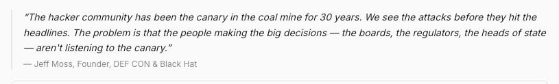 The people who understand how systems break , the security researchers, the ethical hackers, the competition winners, are almost entirely disconnected from the people who write policy, allocate budgets, and govern critical infrastructure. If we want governance and regulation that actually works at the speed this problem demands, the technical community has to be in the room where decisions are made.