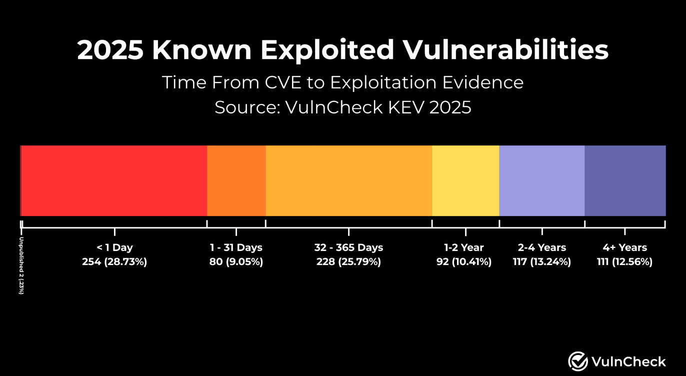 If you’re in security, compliance, or engineering leadership, that trajectory should absolutely get your attention. This isn’t a trend that stabilizes, it’s a collapse. It’s corroborated in other sources too, such as my friend Patrick Garrity, a Vulnerability Research at VulnCheck, who found that nearly 30% of CISA KEV’s were exploited on or before the day the CVE was even published.