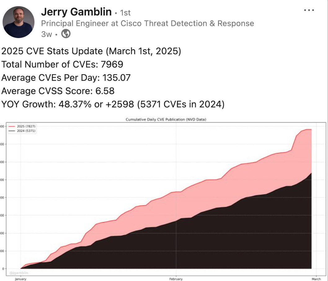 It’s a widely discussed topic that CVEs are growing exponentially YoY. Earlier this year, I published a piece on prioritization, citing metrics from Vulnerability Researcher Jerry Gamblin, which projected what 2025 would look like. So far, we’ve stayed true to the projections and even exceeded them.