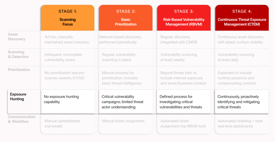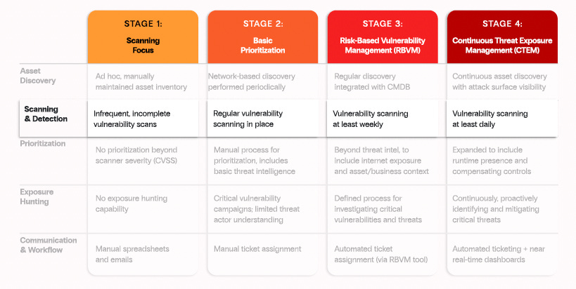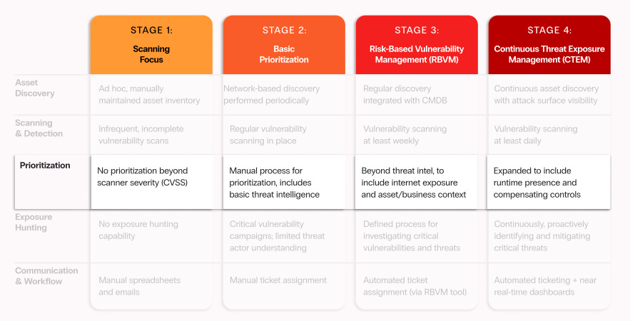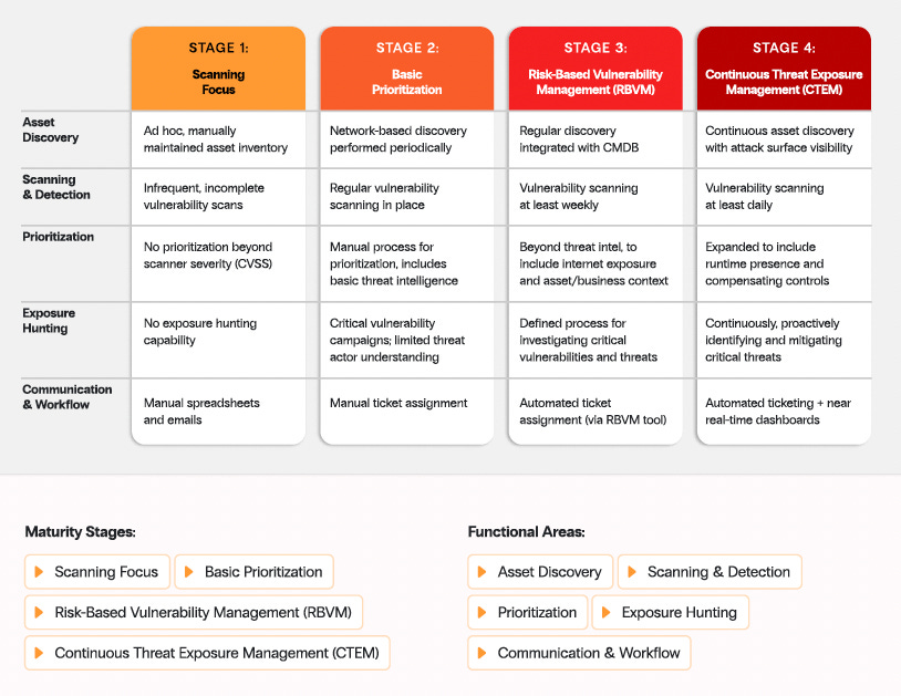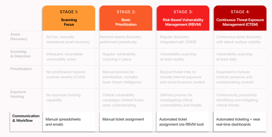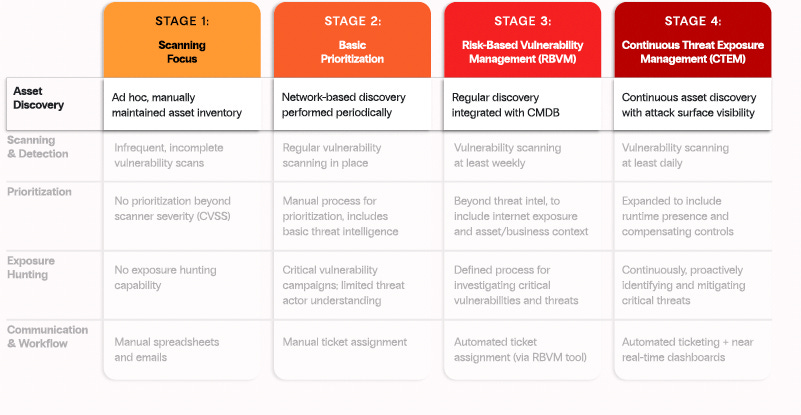 The stages of maturity that Zafran’s CTEM guide covers span maturity from an initial effort to establish a cadence and improve visibility gaps, through automating and aligning with real-time changes to assets and environments.