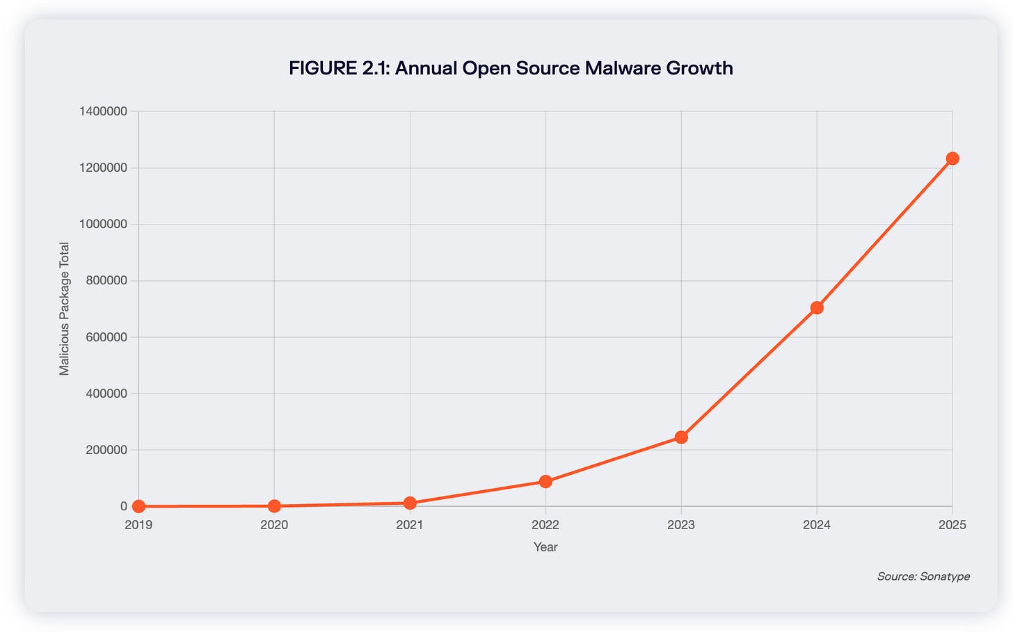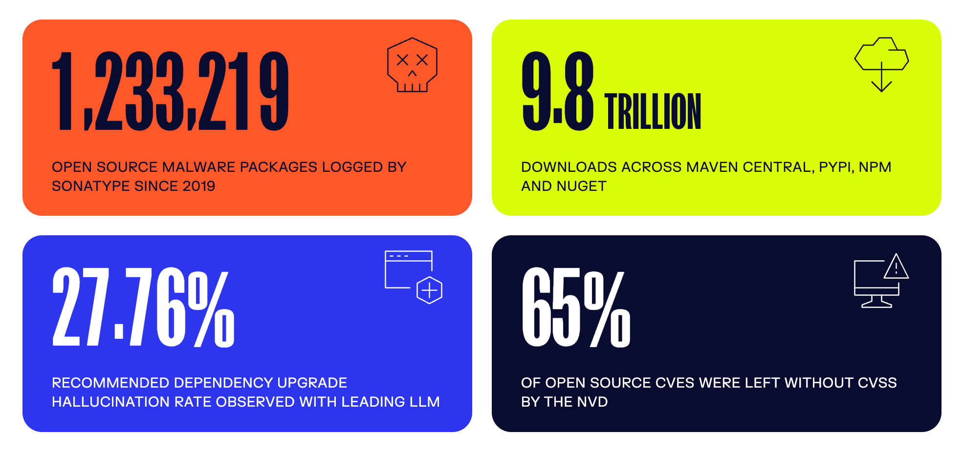 Sonatype’s 2026 State of the Software Supply Chain report shows developers downloaded components 9.8 trillion times in 2025 across Maven Central, PyPI, npm, and NuGet. Open source malware has surpassed 1.2 million packages, with 454,648 new malicious packages discovered in 2025 alone, a 75% increase. Sonatype observed an 18% decline in actively maintained open source projects, meaning the codebase is growing while the people maintaining it are shrinking.