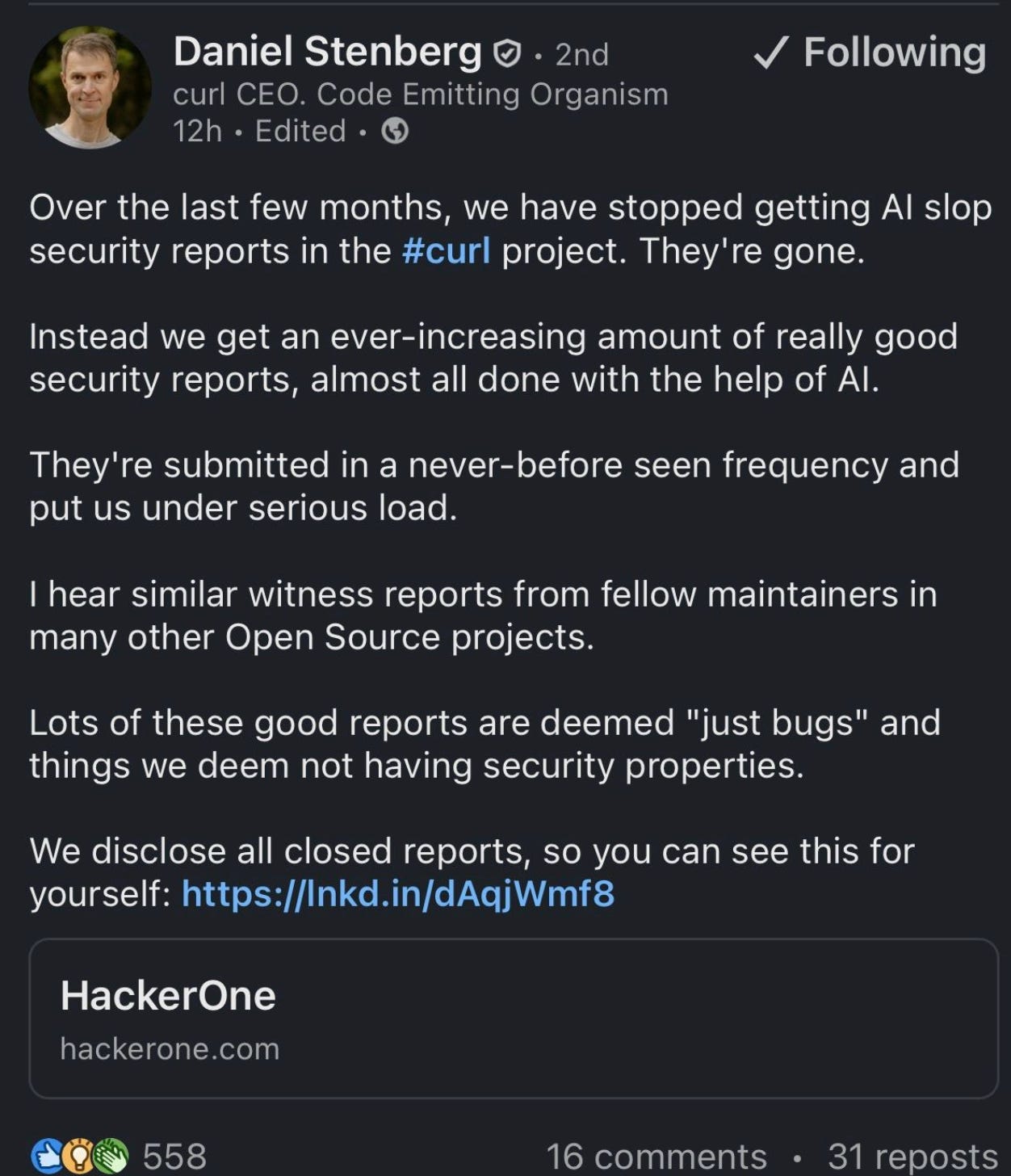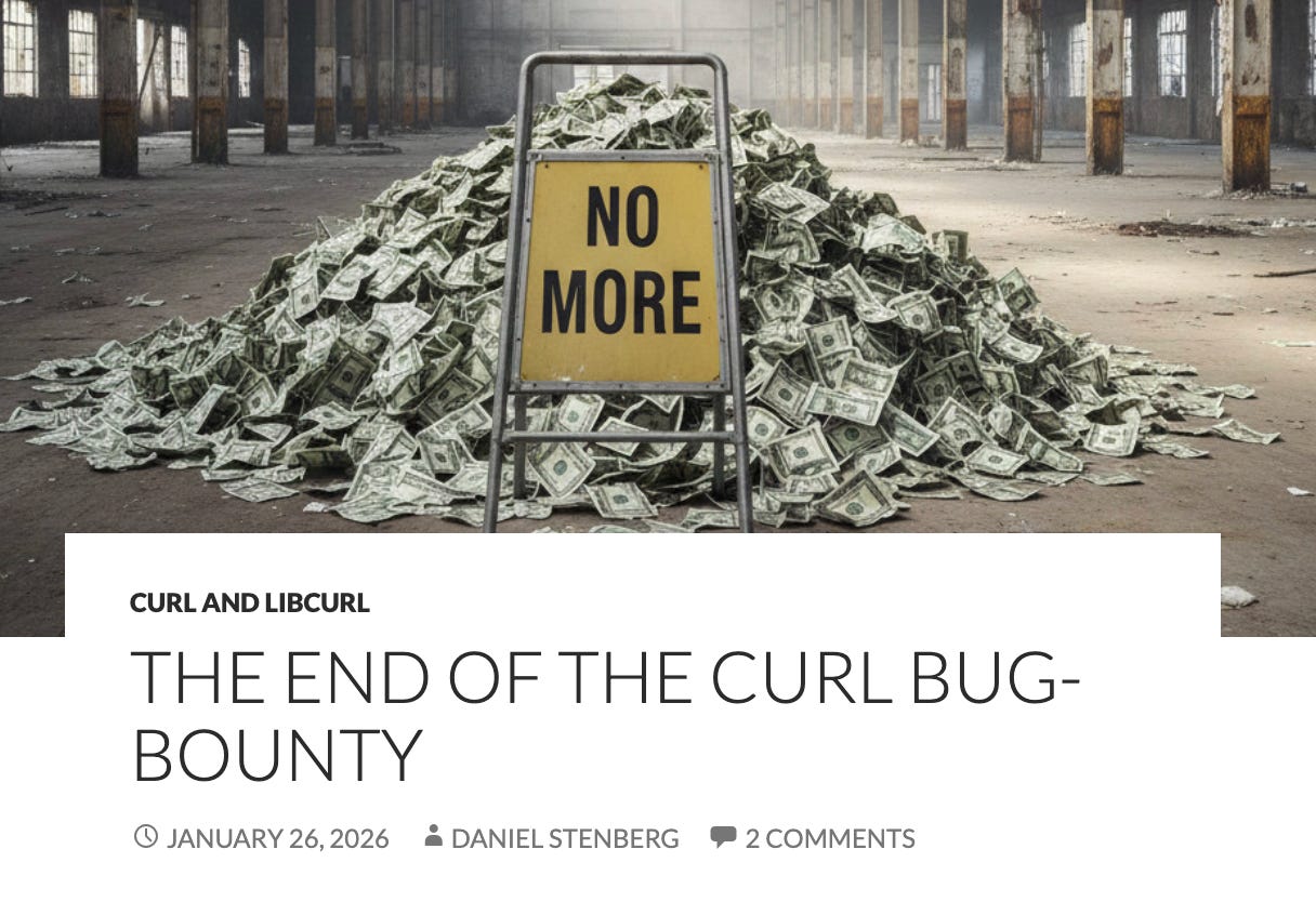 In January 2026, Daniel Stenberg, the maintainer of cURL, one of the most widely used open source projects on the planet, shut down the project’s bug bounty program on HackerOne. The reason was straightforward, he was drowning in AI-generated slop. Confident, detailed, and completely fabricated vulnerability reports were flooding in from people using LLMs to chase bounty payouts. The volume was unsustainable, and the signal-to-noise ratio had collapsed.