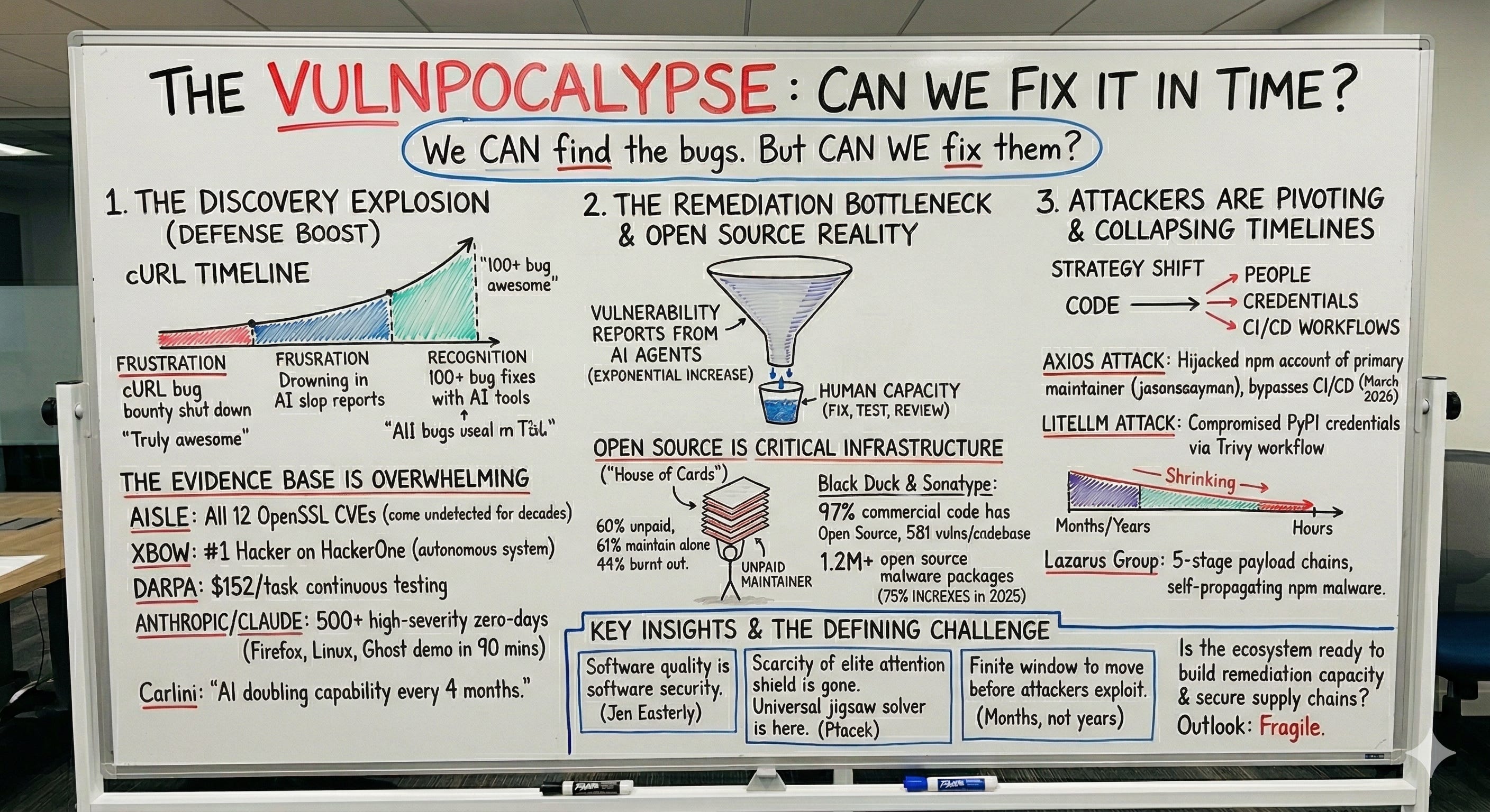 Here is how I think about this. We have a finite and closing window to use AI to find and fix vulnerabilities before malicious actors find and exploit them. The technology to discover bugs at scale is here. AISLE proved it with OpenSSL. Anthropic proved it with 500 zero-days. XBOW proved it on HackerOne. cURL proved it with over 100 bug fixes, and if Carlini is right that this capability is doubling every four months, the window to get ahead of attackers is measured in months, not years.