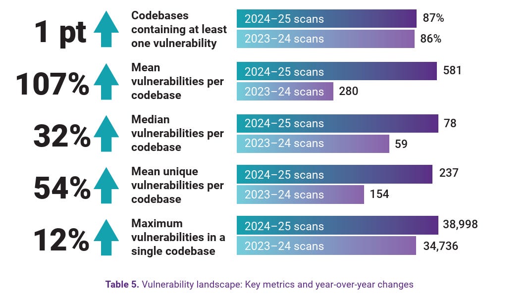 Over 48,000 CVEs were published in 2025 alone, a 21% increase over the prior year. The Black Duck OSSRA data shows that 90% of audited codebases contain open source components more than four years out-of-date. These are not obscure dependencies. Applications contain an average of 911 open source components, and many of those carry known, unpatched vulnerabilities that organizations have not gotten to yet.