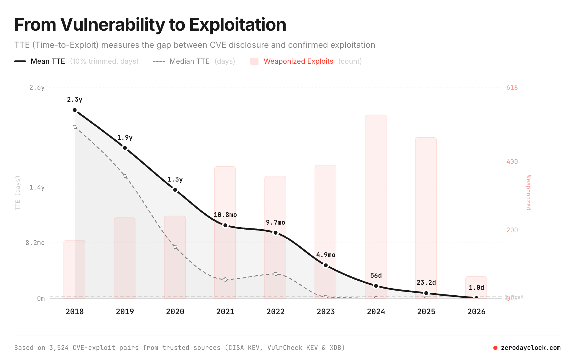 I recently interviewed Sergej Epp about his Zero Day Clock project, which tracks the collapse of exploitation timelines. In 2018, the median time from vulnerability disclosure to first observed exploit was 771 days. By 2023, it was 6 days. By 2024, it was measured in hours. And in 2025, the majority of exploited vulnerabilities were weaponized before they were even publicly disclosed. 67% of exploited CVEs in 2026 are zero-days, up from 16% in 2018.