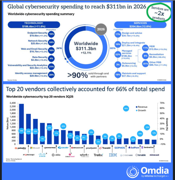 But the cybersecurity market is deep, complex, and multi-layered. Endpoint protection, identity, network security, threat intelligence, incident response, these are domains where outcomes, organizational context, real-time threat data, and deep enterprise integration still matter enormously along with the services aspect, especially as organizations continue to mature and shift to buying outcomes not just tools, a point made recently by Omdia’s Chief Analyst Jay McBain, who pointed out that services revenue is now 2x products.