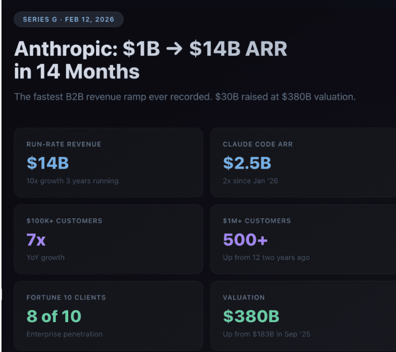 Consider the numbers. Anthropic’s revenue trajectory tells the story better than any analyst note. They went from $1 billion in annual recurring revenue in December 2024 to $4 billion by mid-2025, $9 billion by end of 2025, and $14 billion in February 2026. That’s $1B to $14B in roughly 14 months.