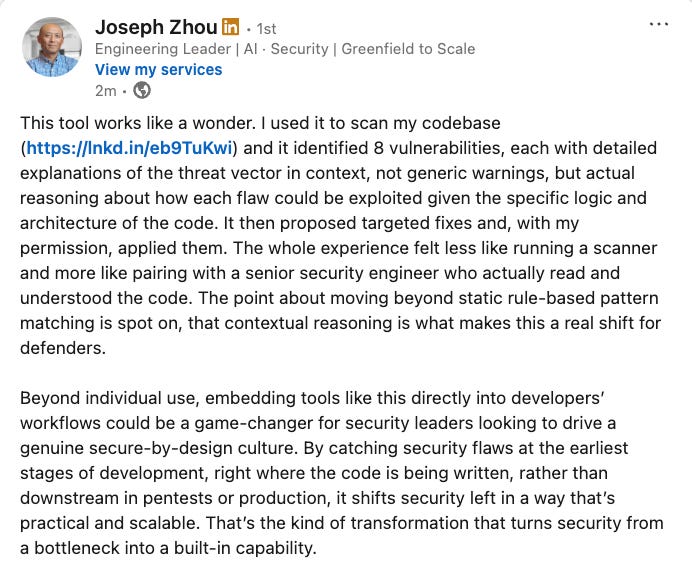 And, to our credit, not only are many enterprise organizations and CISOs looking to do that, so are many existing and innovative new AppSec startups, but, the frontier labs expanding their native capabilities throws a curveball into that equation, and at a pace and distribution scale that many AppSec companies and teams simply can’t operate at.